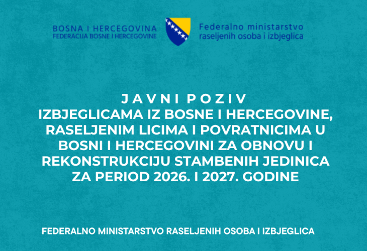 Predmet Javnog pozivaSufinansiranje i finansiranje obnove i rekonstrukcije stambenih jedinica izbjeglica, raseljenih lica i povratnika na području Bosne i Hercegovine kroz dodjelu jednog od sljedećeg: građevinskog materijala / dodjele finansijskih sredstava za ugradnju građevinskog materijala ili obnove stambenog objekta po principu „ključ u ruke“. JP_rekonstrukcija_2026-2027Downloadprijavni_obrazac_i_izjava_za_javni_poziv_rekonstrukcija_i_obnova_stambenih_jedinica_2026-2027Download Rok za prijave je 25.12.2025. godine.