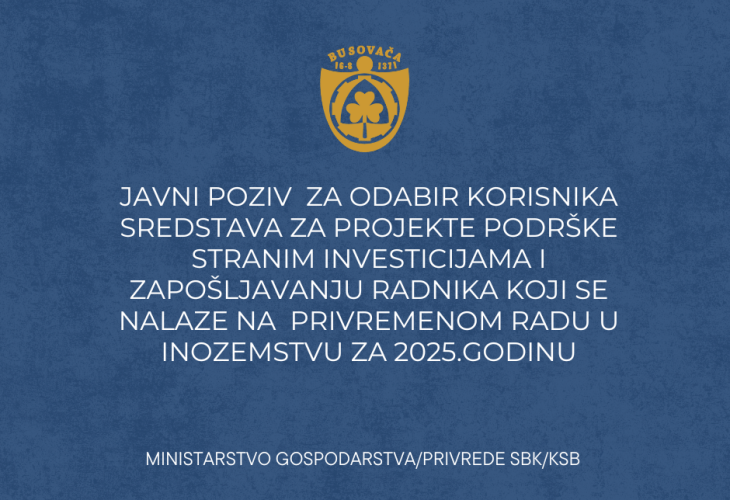 Obavještavaju se zainteresovana privredna društva i obrtnici da je dana 13.11.2025.godine na web platformi Ministarstva privrede www.eprivreda.ba objavljen Javni poziv za odabir korisnika sredstava za projekte podrške stranim investicijama i zapošljavanju radnika koji se nalaze na privremenom radu u inozemstvu za 2025.godinu. Prijave sa odgovarajućom dokumentacijom dostavljaju se isključivo putem web platforme www.eprivreda.ba Privredna društva i obrtnici prije podnošenja prijave su dužni da se registruju na web platformi „eprivreda“ www.eprivreda.ba, ukoliko već nemaju registrovan korisnički nalog. Obavijest o Javnom pozivu (pdf.)